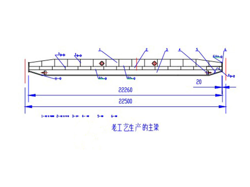 電動單梁起重機主梁原來主要采用U型槽加筋板焊接工字鋼,然后焊接兩側板再聯(lián)接端梁的方式制作。該工藝缺點是U型槽生產效率低、勞動強度大、焊接費用高、焊接工序耗時較長,焊接變形量大,焊接過程產生較多電焊煙塵,污染嚴重,在進行多段拼板、焊接、整形的過程中,焊接質量難保證,時有主梁橫向焊縫產生裂紋缺痕。